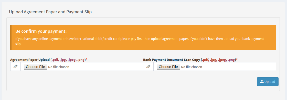 - Inser bank payment slip ( Image or pdf format ) in Payment Document Scan Copy Click ‘Upload’